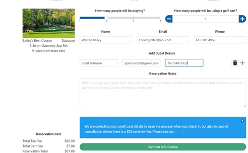 The blue section lists how your reservation is being charged. Some courses take full payment at time of booking, others will reserve the time and only charge your credit card at the golf course or if you "no show" for your designated tee time. The bottom left shows the amount being reserved/charged on the credit card. Once all the information is complete, press the Payment information button.