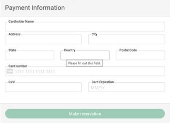 The Payment Information screen pops up. All fields must be filled in and accurate to accept the reservation. Cardholder Name must be exactly the same as the credit card. The Address, City, State, and Postal Code must be the same as the billing address for the credit card being used. After entering the Card number and the 3 digit security code on the back of your credit card (CVV), complete the Card Expiration date. Once everything is filled in, the Make reservation button will turn dark green. Press it!